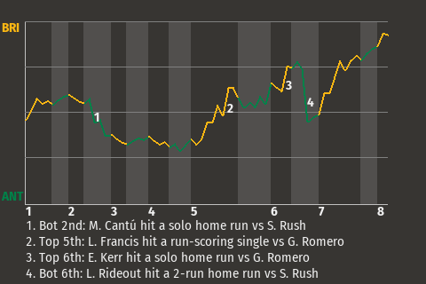2 (4, 2nd Inning off S. Rush, 0 on, 2 outs; 6th Inning off S. Rush, 1 on, 1 out)