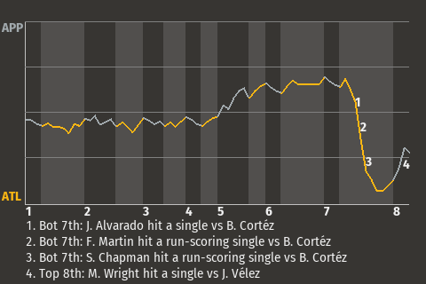 Atlanta grabbed control in the bottom of the seventh. With one out and runners on 1st and 2nd, Scott Chapman delivered a run-scoring single, to make it 2-1 in favor of the Hurricanes.